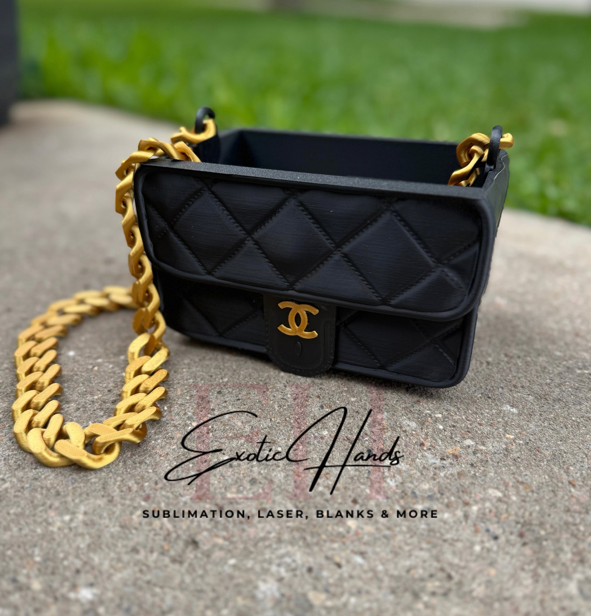 Level up your storage game with our luxury inspired 3D printed box, perfect for holding trinkets, accessories, or small crafting supplies. Featuring a quilted black exterior and bold gold chain detailing, this elegant piece channels high-end fashion with a functional twist. A standout item for any vanity, craft room, or gift set. Handcrafted with precision for lovers of style and creativity.